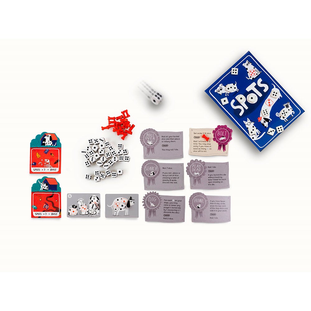 On your turn in Spots, you'll be rolling and placing dice onto dog cards. Dice you can't place get buried in your yard. Bury too many dice and you bust. Complete 6 dogs and you win