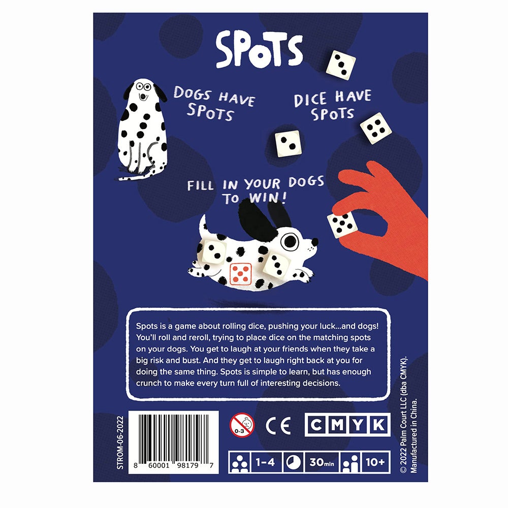 Spots is a casual push your luck game from CMYK. It was designed by Jon Perry, along with Alex Hague and Justin Vickers, and features dozens of adorable dog illustrations from the artist John Bond.