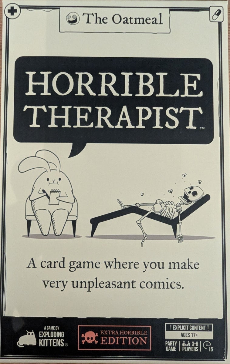 Compete to create the funniest, most unhinged comic about therapy by submitting answer cards to complete a prompt. The player who puts down the funniest final card wins, turning therapy into a hilarious and darkly entertaining experience.