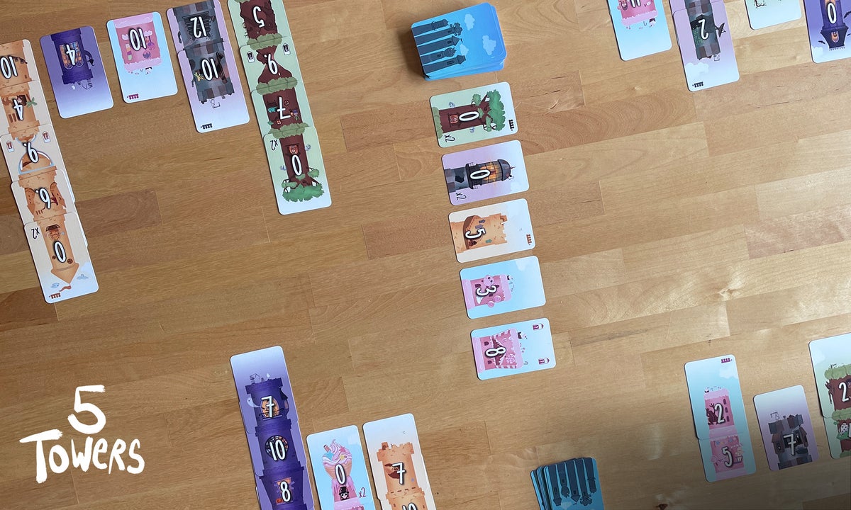 5 Towers -korttipelissä kilpailette kaupungin korkeimpien tornien rakentamisesta! Saat kortteja, jos suostut ottamaan niitä enemmän kuin muut. Saat kuitenkin rakentaa vain yhden tornin kutakin tyyppiä, joten varo ottamasta liian monta korttia kerralla, ettet hankaloita omaa rakentamistasi!
