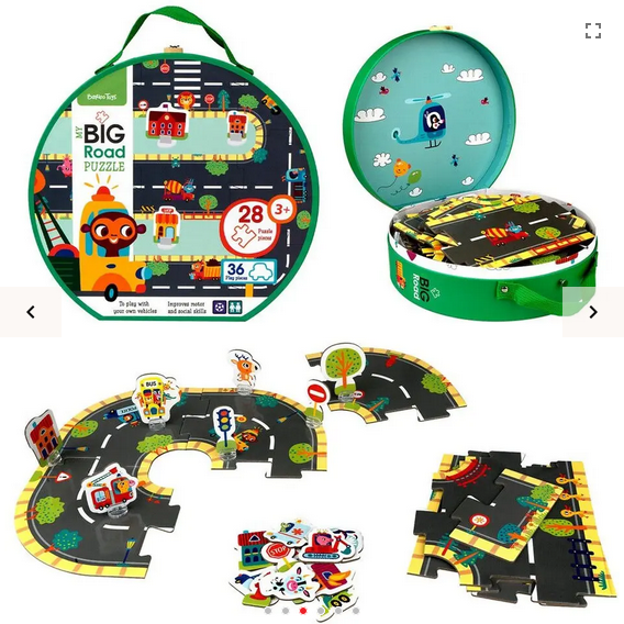 Rakenna erilaisia katuratoja tällä palapelillä. Reilunkokoisia tiepaloja yhteensä 28 kpl. Mukana myös lisäpaloja elävöittämään leikkiä kuten liikennemerkkejä, puita ja hahmoja. Tukevaa kartonkia. Säilytys tukevassa kartonkisessa salkussa. Ikäsuositus: 3+.
