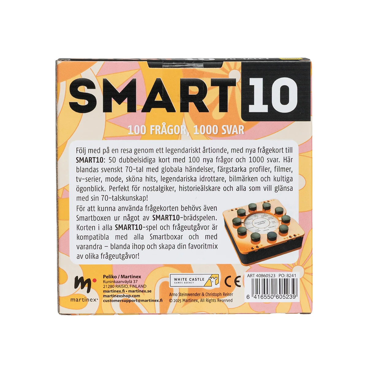 Pelaamiseen tarvitaan kysymyskorttien lisäksi jonkin SMART10-pelin Smartbox. Kaikkien Smart10-pelien ja -kysymyspakkojen kortit sopivat kaikkiin Smartboxeihin! Voit myös luoda oman suosikkiversiosi yhdistelemällä osia eri kysymyspakoista toisiinsa.