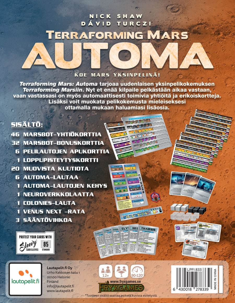 Terraforming Mars: Automa tarjoaa uudenlaisen yksinpelikokemuksen Terraforming Marsiin. Nyt et enää kilpaile pelkästään aikaa vastaan, vaan vastassasi on myös automaattisesti toimivia yhtiöitä ja erikoiskortteja. Lisäksi voit muokata pelikokemusta mieleiseksesi ottamalla mukaan haluamiasi lisäosia.