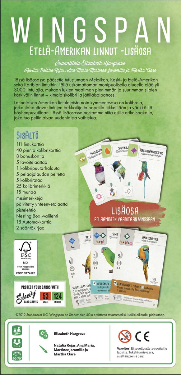 Tässä lisäosassa pääsette tutustumaan Meksikon, Keski- ja Etelä-Amerikan sekä Karibian lintuihin. Tällä uskomattoman monipuolisella alueella elää yli 3000 lintulajia, mukaan lukien maailman pienimmän ja suurimman siipien kärkivälin linnut – kimalaiskolibri ja jättiläisalbatrossi. Latinalaisen Amerikan lintulajeista noin kymmenesosa on kolibreja, jotka ilahduttavat lintujen tarkkailijoita nopeilla liikkeillään ja värikkäillä höyhenpuvuillaan. Tässä lisäosassa nostamme niitä esille erikoispakalla, joka tuo peliin aivan uudenlaista vaihtelua.